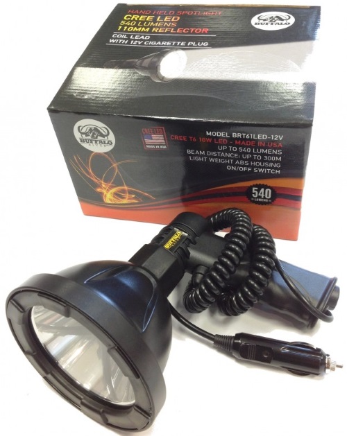 Buffalo River T6 10W LED Handheld Spotlight - The 540 lumen Cree LED and 110mm reflector spotlight produces a 300m beam and the internal 4.2v 2.3ah Lithium, rechargeable battery will allow a 2½ hour continual run time. Constructed from light weight yet rugged ABS the total weight is only 390g. Supplied with a charger with a 12v cigarette plug coil lead that can be plugged into the car or can be powered from an external 12v powerpack.