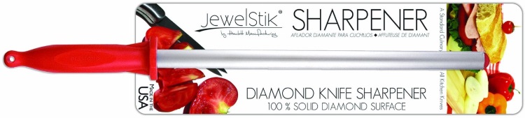 A kitchen gem once available only to professional chefs is now available to the public. the jewelstik diamond sharpener is lightweight, well balanced and easy to use. Its lens shaped steel shaft permits more efficient sharpening than ordinary cylindrical-shaped tools by allowing more surface to be sharpened in less time. a few swipes across the shaft are all that is needed to keep a perfectly sharp edge. The edges produced are flawless, gap free, razor-sharp and long lasting. available in 5", 10" and 12" lengths in both professional and consumer widths.