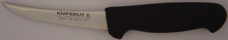 The Knifekut Montana Boning Knife 5in has a 13cm curved blade with a medium flex made from quality German steel. It has an industrial grade plastic resin handle with an anti slip texture.