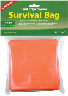 The Coghlan's Survival Bag provides instant protection against rain, wind and cold. Emergency shelter doubles as a ground sheet. Can be used as a distress signal or for storing gear. Also helps prevent hypothermia by holding in body heat. Made from 3-mil polyethylene.